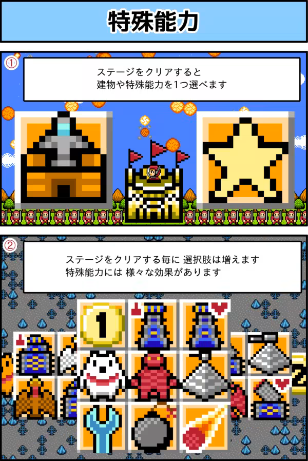 • ステージをクリアすると、建物や特殊能力を1つ選べます。
