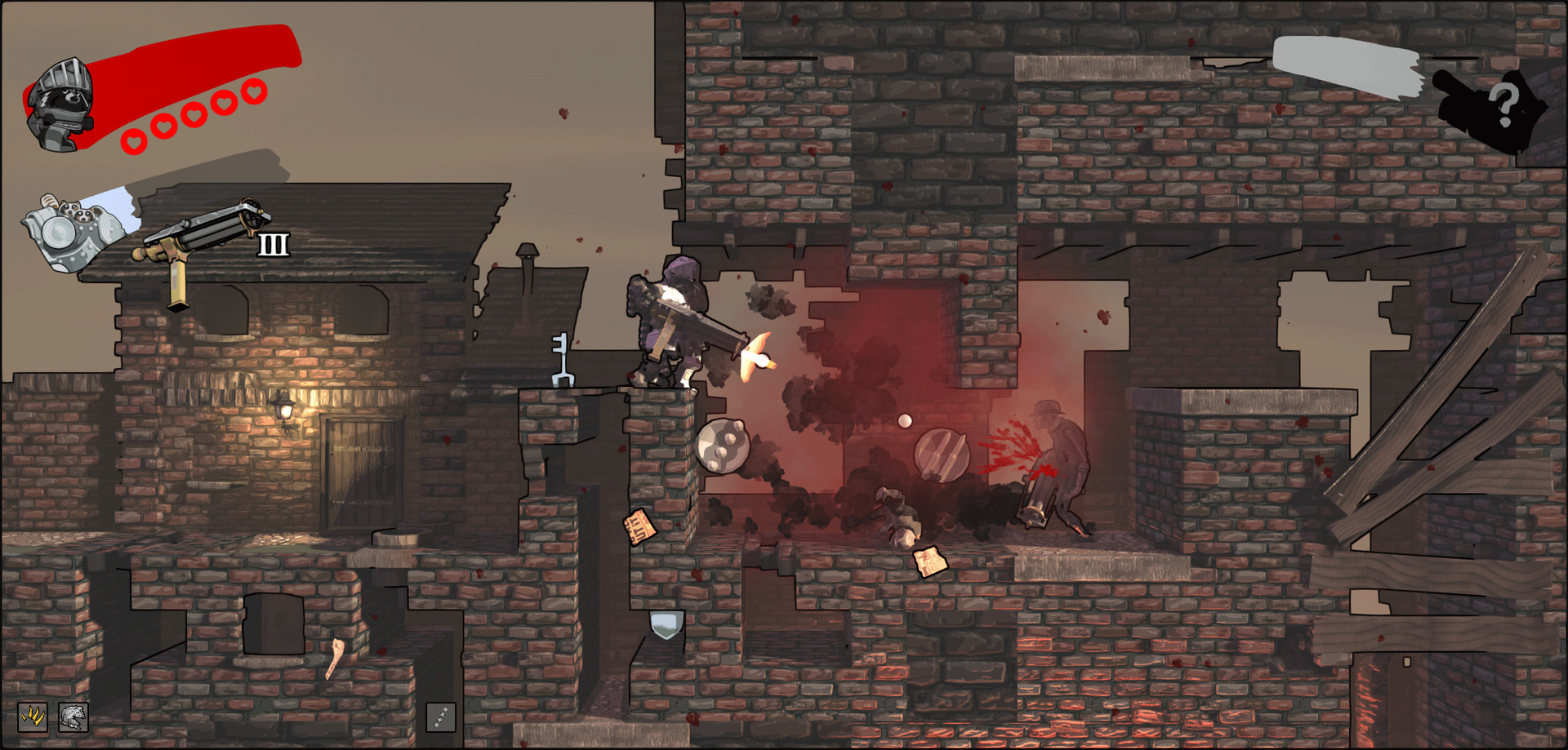 How many raccoons does it take to fire a cannon? What is the maximum transport range of a trash can? Answer these important questions in Animosity: a procedurally-generated platformer that takes you from the fires of revolution to the edge of space. You play as a special red-tailed raccoon who must liberate the species from the angry ape menace. Join together to fight tooth and nail, bolt and bullet against those who want you dead.