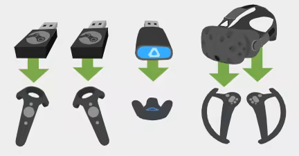NOTE: Each extra HTC Vive tracker/ controller require a SteamVR USB dongle. You can connect a lighthouse headset to USB and power only (Not video) to get it working as 2 usb SteamVR dongles.