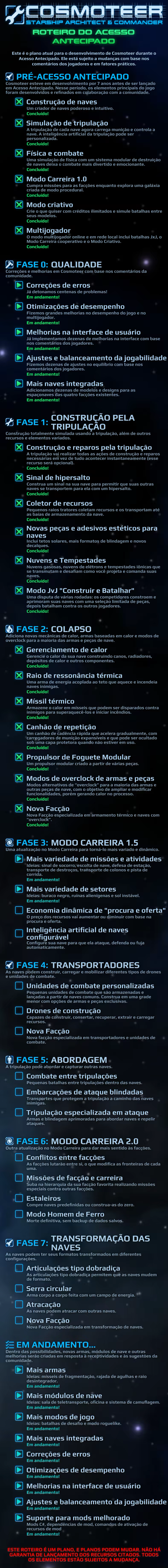 "Estimamos que Cosmoteer ficará em período de acesso antecipado por dois anos, embora isso esteja sujeito a mudanças conforme o escopo do projeto muda. Confira o Roteiro de Acesso Antecipado para saber mais. Cosmoteer já está em desenvolvimento ativo e continuado há muitos anos. Tenha certeza de que queremos manter o jogo estável e divertido ao longo de todo o processo. Você não receberá um produto inferior caso a gente decida postergar o lançamento oficial para adicionar mais recursos incríveis."