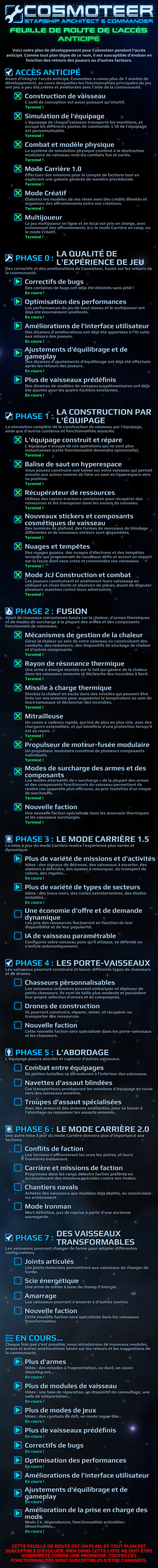 « Cosmoteer devrait rester en accès anticipé pendant deux ans environ, même si ces plans sont susceptibles d'évoluer de pair avec l'ampleur du jeu final. Veuillez consulter la feuille de route de l'accès anticipé pour en savoir plus. Cosmoteer est en développement depuis de nombreuses années, et nous continuerons à tout faire pour garder le jeu stable, fun et jouable à tout moment. Vous ne risquez certainement pas de vous retrouver avec un produit inférieur si nous décidons de repousser le lancement pour introduire toujours plus de fonctionnalités incroyables. »