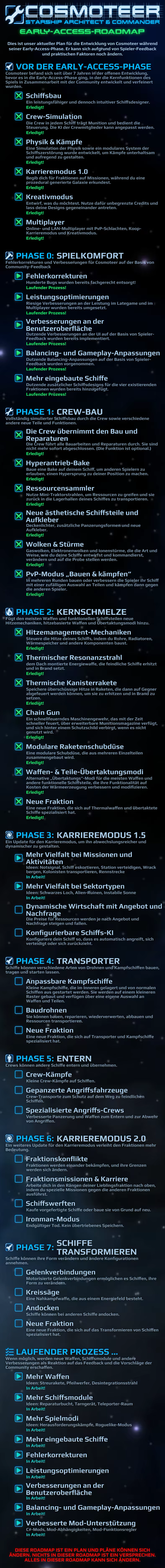 „Wir rechnen damit, dass Cosmoteer circa zwei Jahre lang im Early-Access-Modus verfügbar sein wird, auch wenn sich dies im Zuge der Entwicklung des Spielumfangs ändern kann. Bitte sieh dir die Early-Access-Roadmap an, um mehr zu erfahren. Cosmoteer wird schon seit vielen Jahren aktiv und kontinuierlich weiterentwickelt. Du kannst dir sicher sein, dass wir stets größten Wert auf die Stabilität des Spiels gelegt haben und dies auch weiterhin tun werden, um dafür zu sorgen, dass das Spiel immer Spaß macht und spielbar ist. Du bekommst kein schlechteres Produkt, wenn wir beschließen, den offiziellen Launch nach hinten zu verschieben, um mehr großartige Funktionen zu integrieren.“