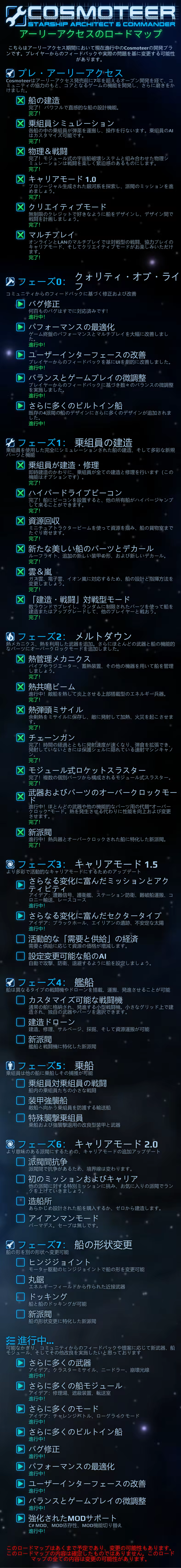 “Cosmoteerの早期アクセス期間には約2年間を見積もっていますが、ゲームの範囲によって変更となる可能性があります。詳しくは、早期アクセスのロードマップをご覧ください。Cosmoteerはすでに長年にわたって活発に開発が行われています。ご安心ください。私たちはこれまでにも、そしてこれからも、安定性とゲームの楽しさ、プレイしやすさを保つことに努めます。より素晴らしい機能を詰め込むために、正式リリースを延期することになっても、劣悪な製品をお届けすることはありません。”