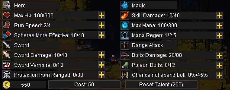 The game is set in a dark pixel fantasy world. Destroy hordes of monsters ruling over what once was a prosperous land. 10 levels filled with various enemies await, you, each requiring a different approach to defeat. Like in any RPG, leveling up is the core element of the game