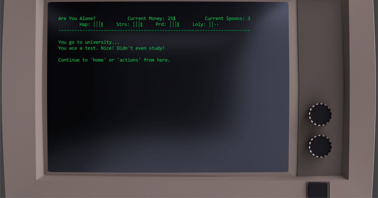 Ask and answer the question- Are You Alone? This is a life, depression, and dating sim about trying to balance unbalanceable things with limited resources. A fully text based life adventure!