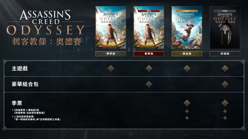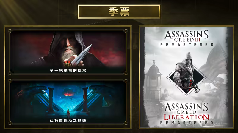 - 季票:2 款擴充內容、1 項任務、以及《刺客教條 3 重製版》與《刺客教條:自由使命重製版》