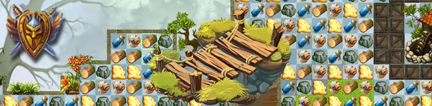 Runefall is unlike any match-3 you've played. With every match you make, the camera moves in the direction of your match, allowing you to travel in all directions and explore the massive levels. Match over sand, grass, and dirt tiles to clear them and discover hidden items like keys to unlock treasure chests, unique quest items, or items to help you get past environmental obstacles like rivers, cliffs, and overgrown vines. Match shield pieces to fill your jump meter and use the mini-map to immediately jump to anywhere in the environment. Match gold, wood, and stone pieces to collect those resources and use them to upgrade the town of Rivermoor. Every town upgrade rewards you with bonuses like new power-ups and abilities.