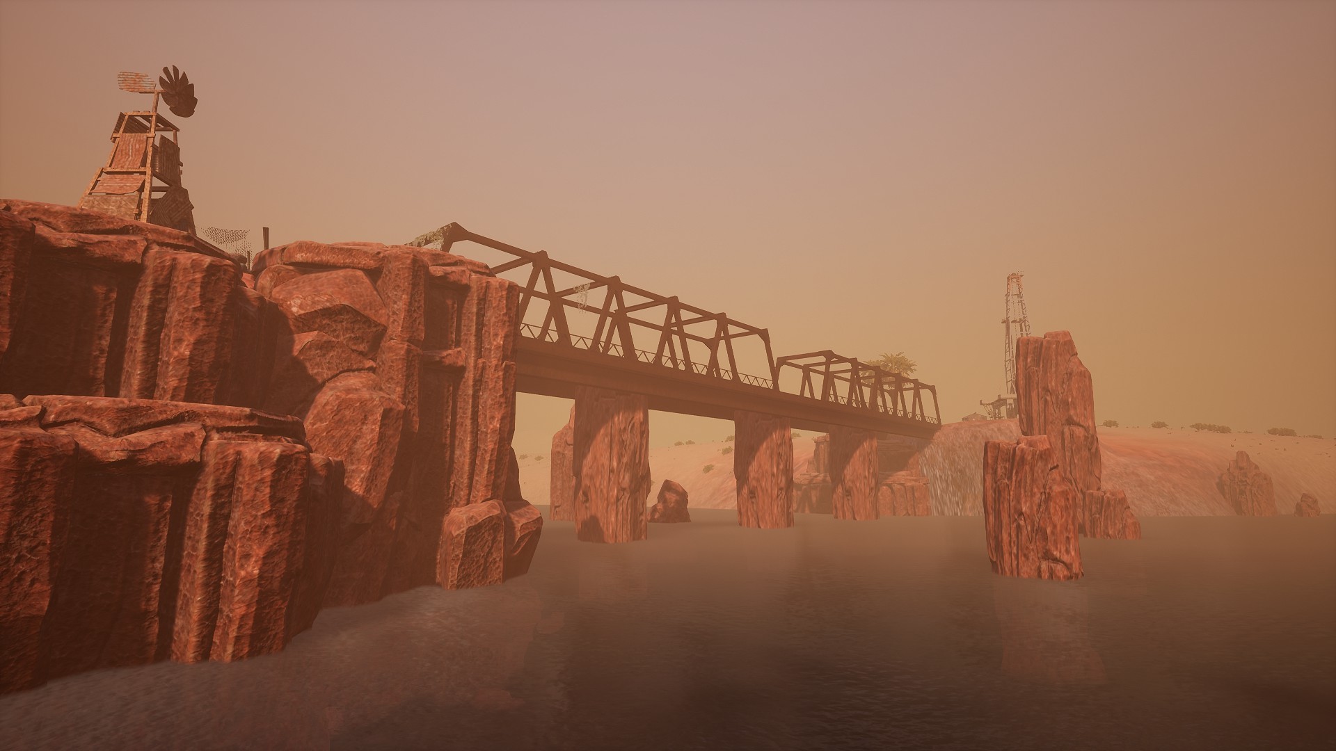 The island consists of a vast desert area measuring 8x8 km (64km2). On the island you can find many resources: trees, stones, uranium, sulfur, metal and others. Each tree can be cut down, and each stone can be split. Traveling around the island you will meet settlements on which valuable things are located. There are also two safe areas on the island where you can sell your goods to a merchant or buy something new. In addition to players, you will meet hostile bots, such as spiders, scorpions, robots.