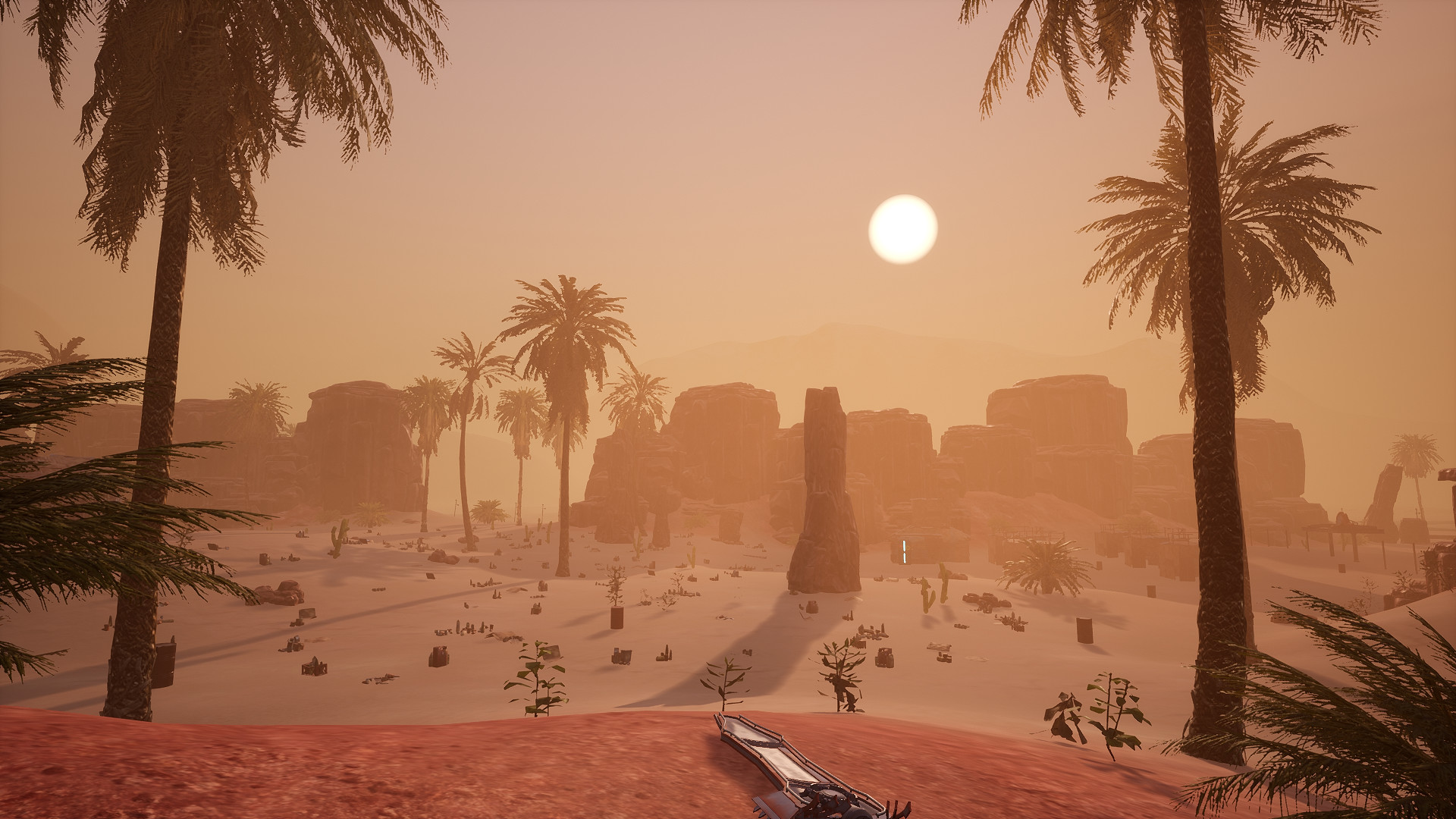 The island consists of a vast desert area measuring 8x8 km (64km2). On the island you can find many resources: trees, stones, uranium, sulfur, metal and others. Each tree can be cut down, and each stone can be split. Traveling around the island you will meet settlements on which valuable things are located. There are also two safe areas on the island where you can sell your goods to a merchant or buy something new. In addition to players, you will meet hostile bots, such as spiders, scorpions, robots.