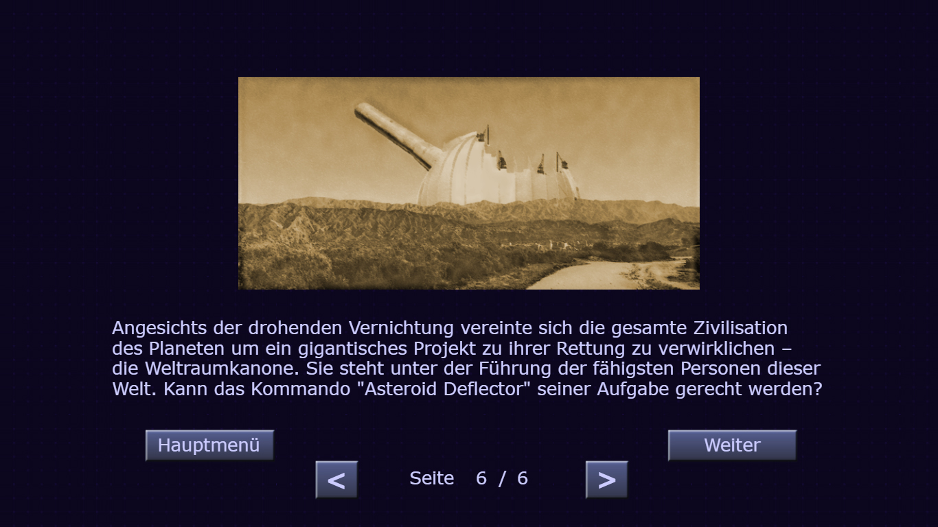 Schütze deinen Planeten indem du den Kurs von Asteroiden mit Geschossen veränderst. Achte dabei auf die Gravitationskräfte und die Werte des Planeten (Bevölkerung, Infrastruktur, Geld).