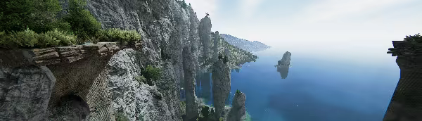 Two distinct universes are to be visited. One is wild and verdant, inspired by the Calanques region in France. An archipelago of islands made of huge white cliffs, deep rift and huge valleys with a Mediterranean vegetation. And the other is very dark, a black world where everything is dead. The wraiths roam these lands forever, and the end awaits you at every corner.