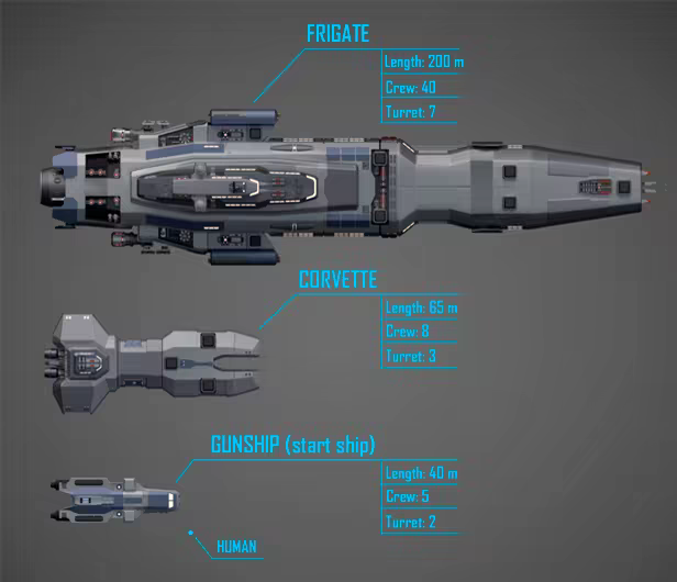 There are several ship classes available: from small patrol ships to larger frigates and cruisers. Ships have many parameters: hull durability, mass, energy, speed, maneuverability, number of boarding capsules, etc. Each ship also has a different number of weapon slots and connections for internal modules. Be careful, because during the travel you may to lose your ship, your crew, and any resources you had stored aboard! The stakes are high. If you lose a ship, you can take same by insurance for a part of cost.