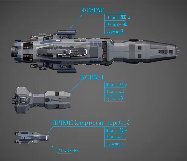 Доступны несколько классов кораблей: от маленького патрульного корабля до огромных фрегатов и крейсеров. Корабль имеет множество параметров: прочность, масса, энергия, скорость, уклонение, количество абордажных капсул. Каждый корабль имеет разное количество орудийных слотов и слотов для внутренних модулей. Будьте осторожны! Во время путешествия вы можете потерять корабль, весь экипаж и полученные ресурсы. Ставки высоки. Если вы потеряете корабль, вы можете получить такой же по страховке за часть общей стоимости.
