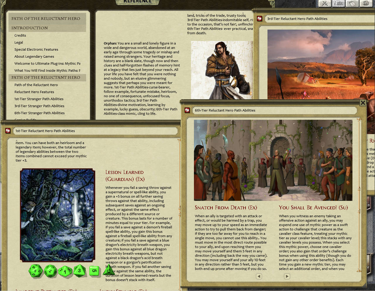 Path of the Reluctant Hero provides over 80 amazing mythic path abilities and reluctant heroics to help build characters that may not see themselves as heroes, but whose sheer grit and determination can see them through any challenge. They will not bow or break, they will not give up on protecting the home and hope they hold dearest to their hearts, and they will never forget that what they are fighting for, peace and freedom, home and happiness, matters more than anything. Whether your reluctant hero is a homebody or simple farmer, an orphan or retired hero, a denier of destiny or a scoundrel with a heart of gold, you'll find all manner of abilities designed to help you tap into unknown reservoirs of strength like rise to the occasion, unflinching, he ain't heavy, and hold onto hope, and may tap into the breadth of their experience with abilities like heirloom, one step ahead, or curse-bearer. A reluctant hero may get through with guile and luck with accidental observation, shot in the dark, lucky guess, and right place, right time, but she's equally adept at applying the keen insights of everyday wisdom with common sense, learning by example, trusty tools, and ever practical. A reluctant hero may seem harmless due to abilities like obscurity, cautious, innocent bystander, and I'm getting too old for this, but when disaster looms a reluctant hero may snatch from death, use everything, or declare that's not fair! or you shall be avenged! Whether your hero traces his roots to simple peasant life, long-faded glory, or a lineage that haunts his destiny, you'll find a wealth of ideas to make your reluctant heroes truly legendary!