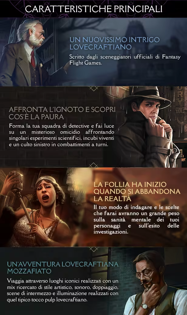 Trova indizi, effettua interrogatori e completa tutti i nove capitoli mentre la trama si dipana. Le tue ricerche ti condurranno in alcuni dei luoghi più famosi dell'universo fantastico di H.P Lovecraft: la Miskatonic University, il manicomio di Arkham e la pericolosa palude.