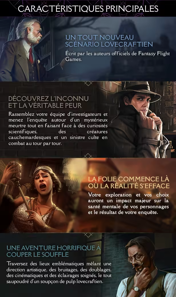 Trouvez des indices, menez des interrogatoires et progressez à travers neuf chapitres pour démêler le vrai du faux. Votre enquête vous mènera vers des lieux emblématiques de l'univers fantastique de H.P. Lovecraft, de l'université Miskatonic à l'asile psychiatrique d'Arkham en passant par le périlleux bayou.