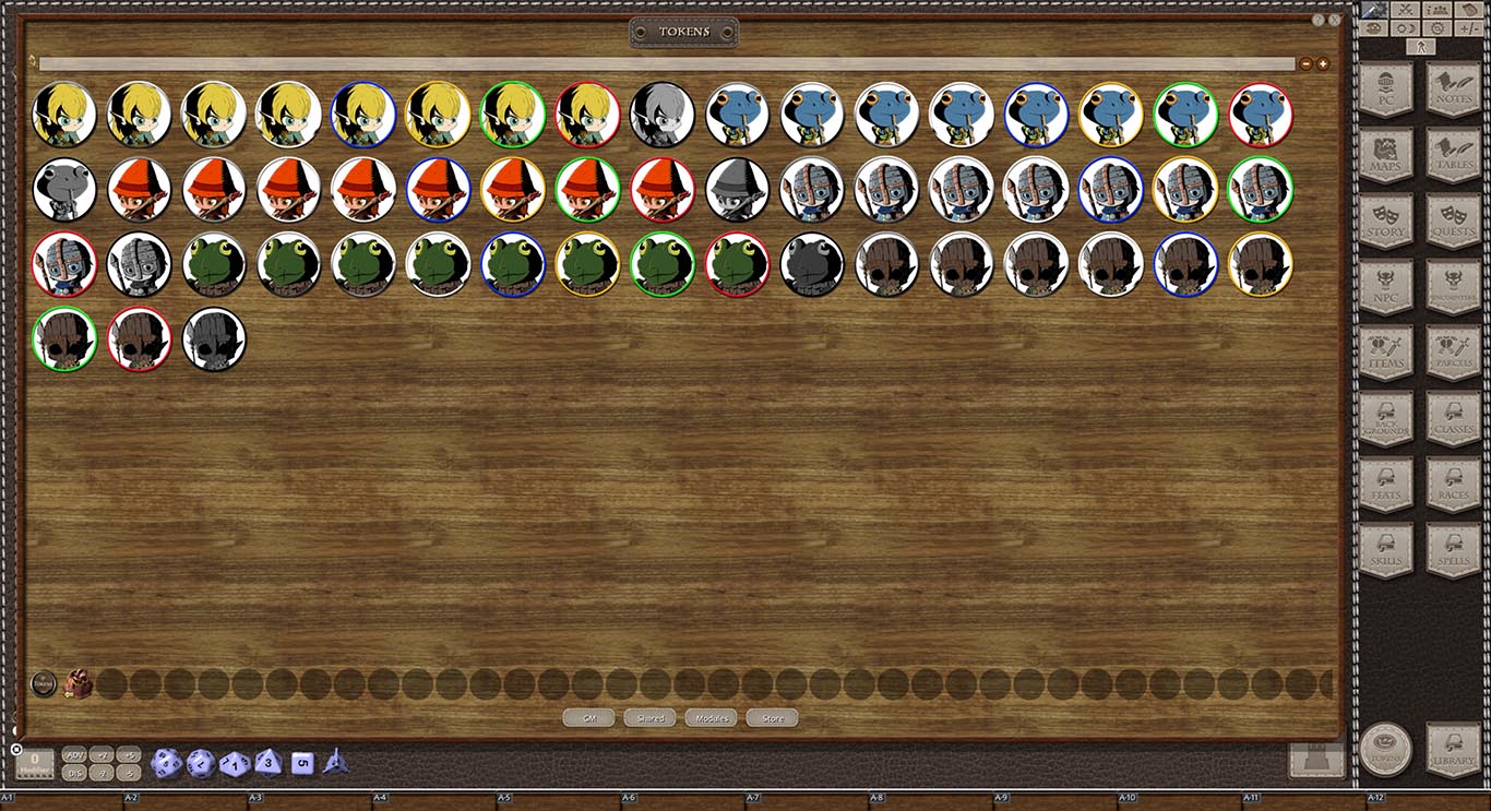 This token pack includes (ringed in black, blue, gold, green, greyscale, and silver):
