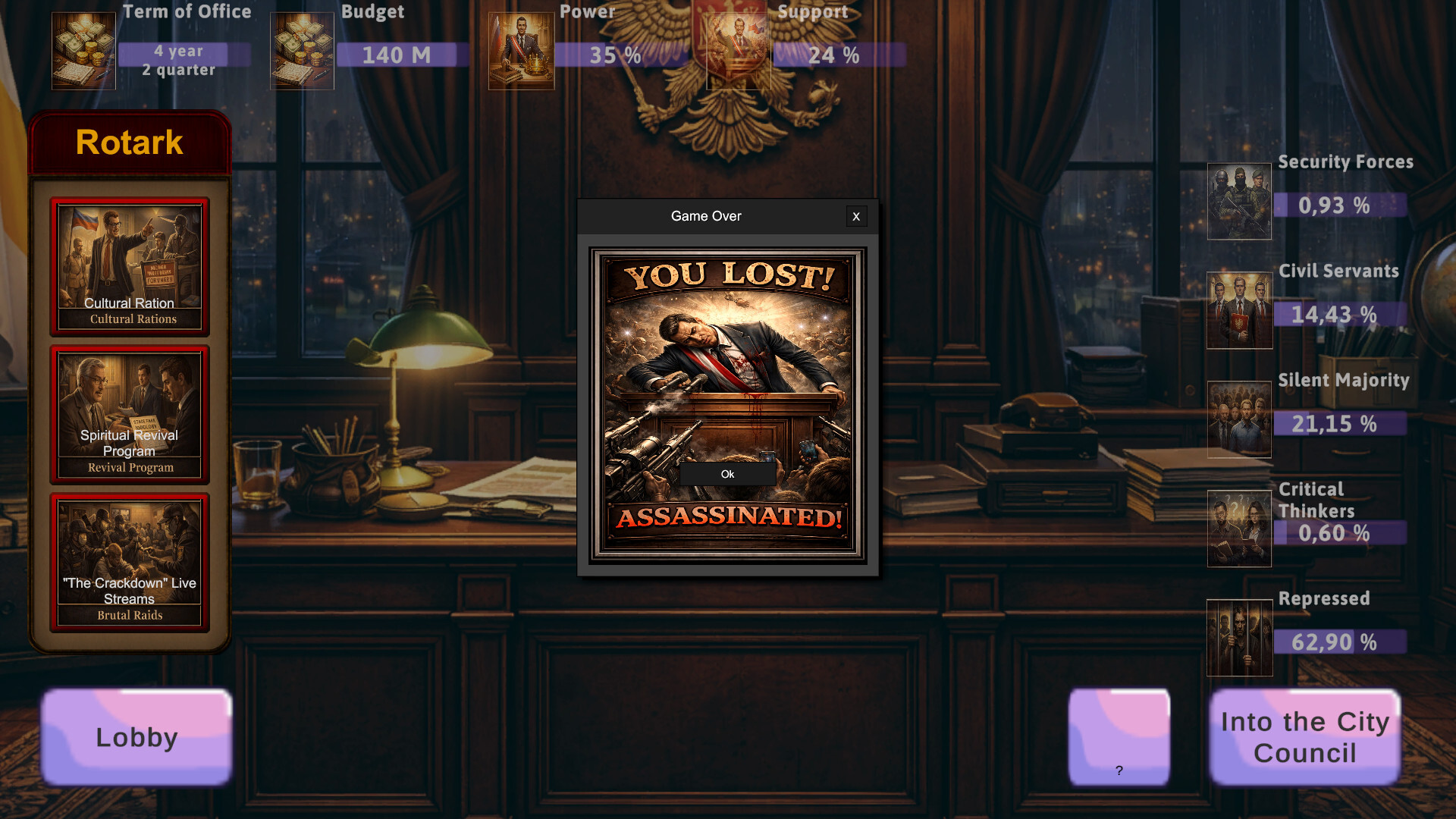 A visual novel-clicker. You are the mayor, choosing laws under pressure from a dictator. Illustrated reforms, a social simulator of society, and a story that changes with your clicks. Can you save the city and your conscience?