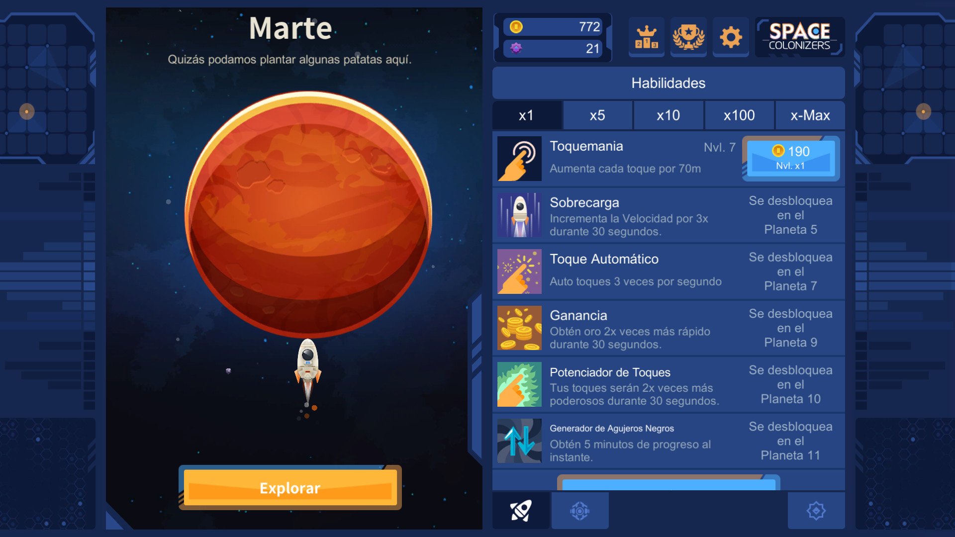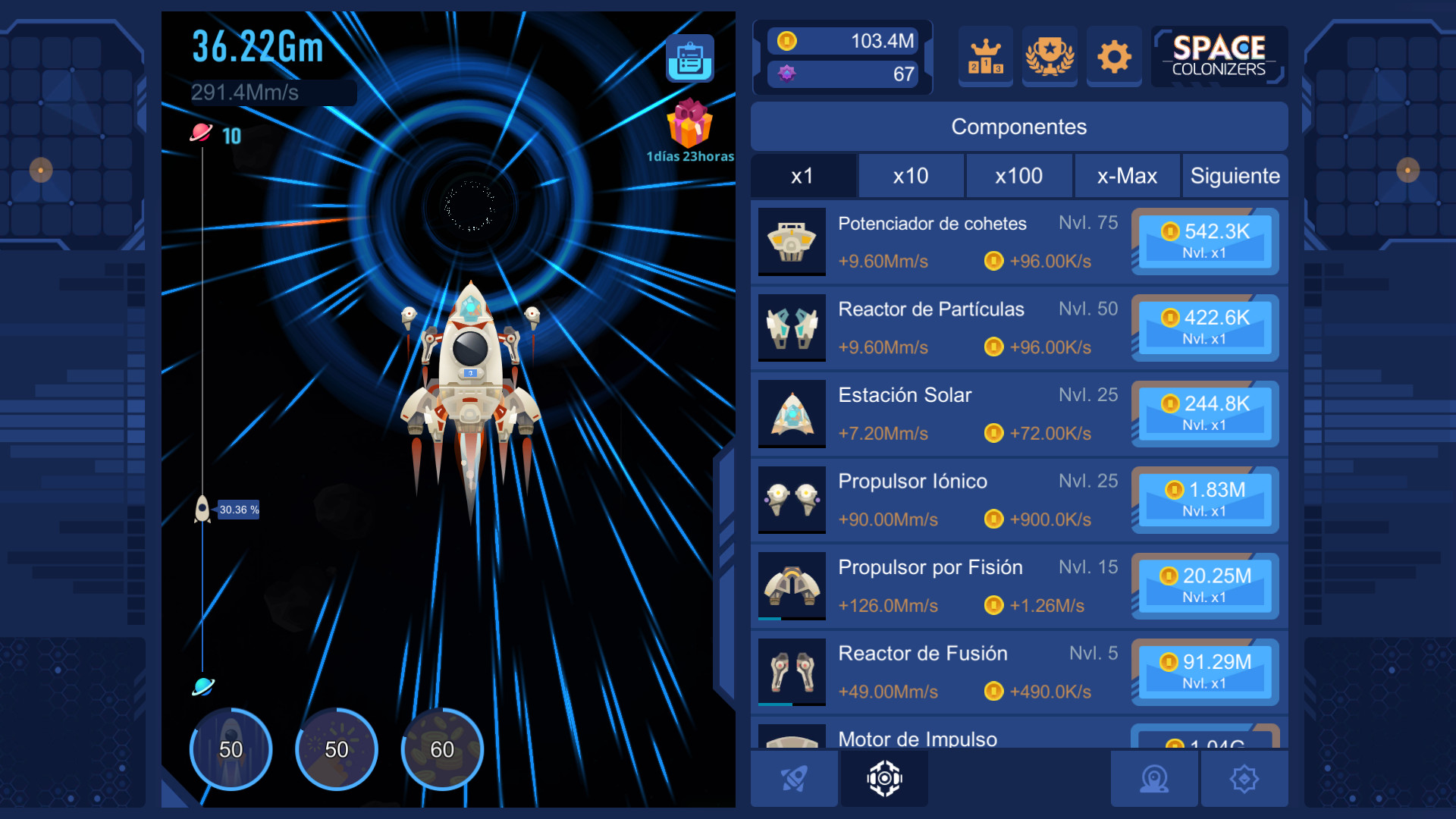 Space Colonizers es un juego incremental de clicker en el espacio inactivo, y también un juego de simulación y estrategia. Dentro del juego, puedes: