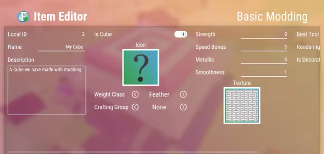 Anyone can make their own mods for Ficterra! We included a built-in mod editor to create your own cubes, items, research and more. You can also take your modding to the next level by using the Unity game engine to include your own textures and 3D models in your mods.