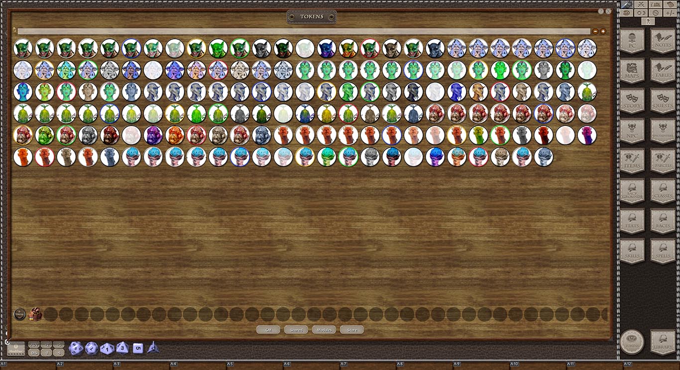 This token pack includes (ringed in black, blue, gold, green, greyscale, and silver, as well as ethereal, invisible, stone-skinned, sand-skinned, and altered state versions):