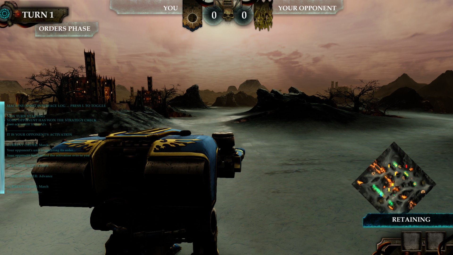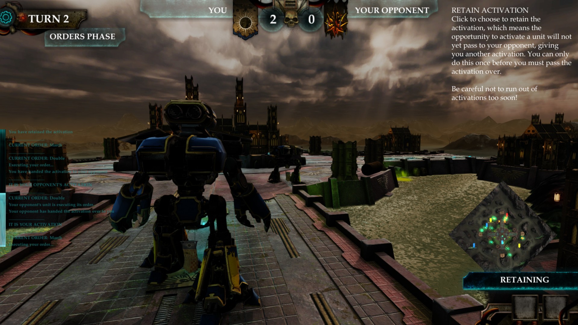 In Dominus, choose to control a force of Titans from the loyalist Legions of Astorum (Warp Runners), Gryphonicus (War Griffons), Crucius (Warmongers) or Osedax (The Cockatrices), or choose from the traitorous Chaos Legions of Mortis (Death Heads), Vulcanum (Dark Fire), Damnosus (Lords of Ruin) and Fureans (Tiger Eyes).