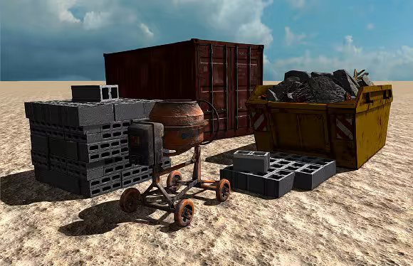 We also added assets to get some real heavy duty work done too, including a cargo container, rusty old skip, extra concrete blocks, and a well-battered cement mixer.