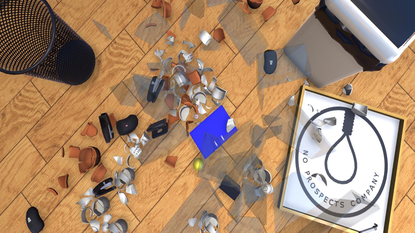 The game takes place in the "No Prospects Company" office, where the player can use a variety of items to hit marked targets. Destruction of the environment is rewarded with additional points. It features brilliant social commentary filled with humour and satire. Unleash your inner wrath in this corporate mayhem simulator!