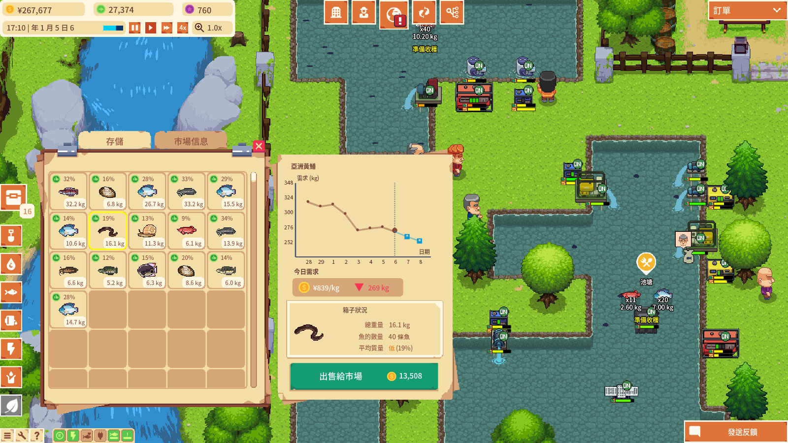 你有兩種選擇來賺錢:客戶訂單及市場銷售。首先,你可以從需要出售某些魚類的客戶那裡獲得一些訂單。第二,查看一下市場價格數據,看看哪種魚的價格最高,然後就養殖該魚類以在市場上出售。