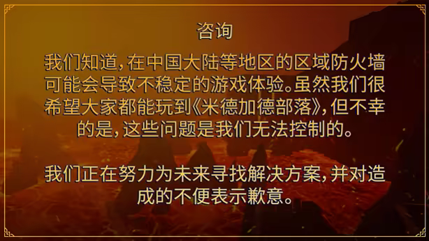 我们知道,在中国大陆等地区的区域防火墙 可能会导致不稳定的游戏体验。虽然我们很 希望大家都能玩到《米德加德部落》,但不幸 的是, 这些问题是我们无法控制的。