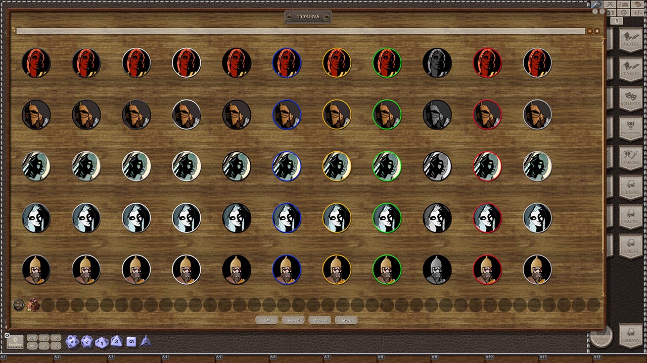 This token pack includes (ringed in black, blue, gold, green, greyscale, red, and silver):