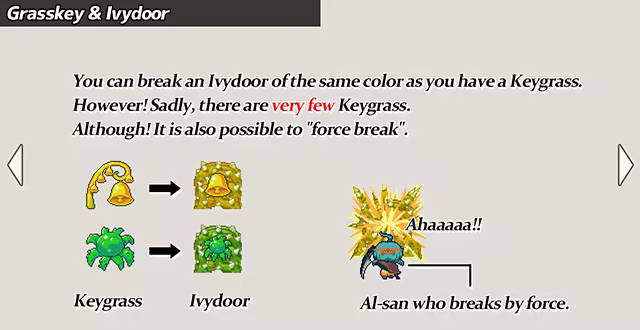 -Al: Walk through the vast Forest of Miracles and look for the exit of the forest. Collect a limited number of "GrassKeys" to get through the countless "IvyDoors" that blocks your path. You can further your exploration by picking up the pieces of Syega