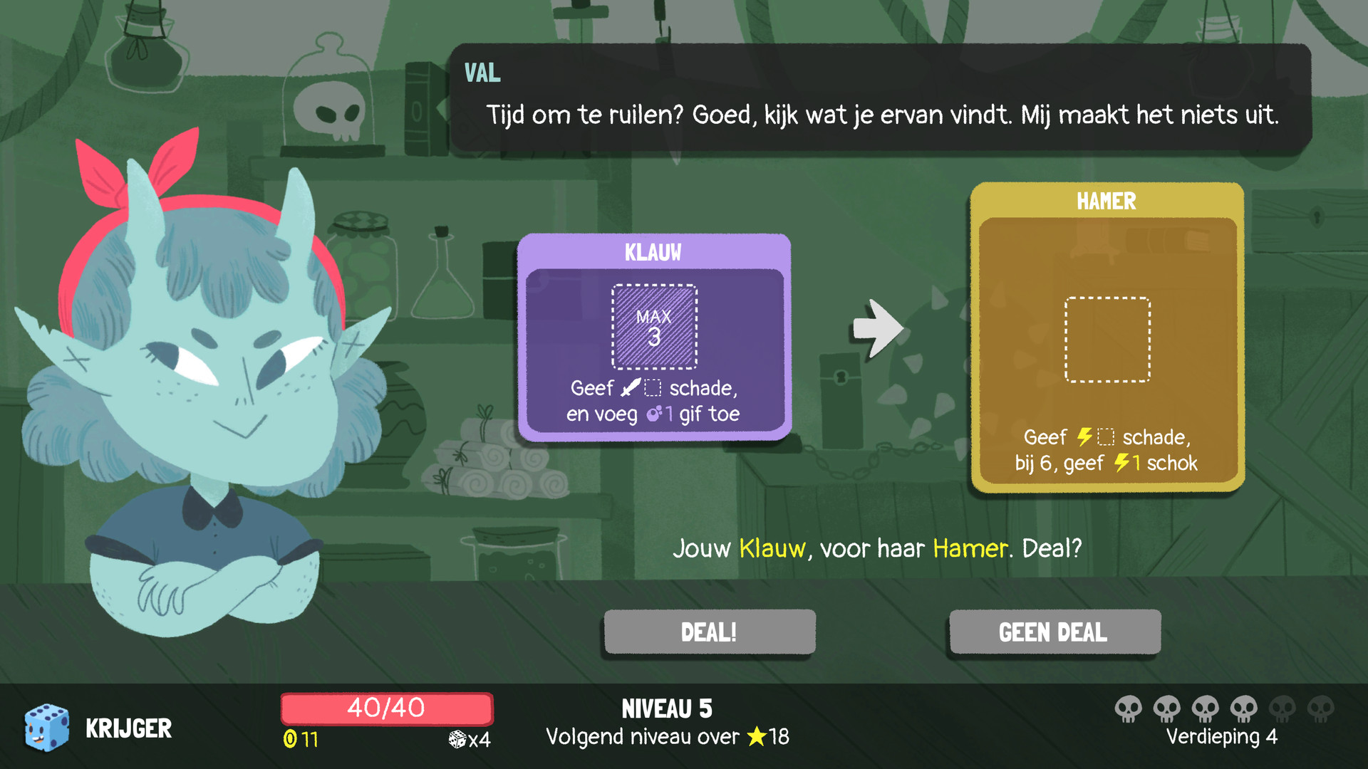 In deze dynamische deckbuilding roguelike van Terry Cavanagh ((Super Hexagon, VVVVVV), Chipzel en Marlowe Dobbe vecht je tegen monsters, vind je betere loot, level je helden en schakel je misschien zelfs de Godin van het Geluk uit: Vrouwe Fortuna zelf. Breng je zorgvuldig geplande strategieën in evenwicht met het onvoorspelbare gedrag van een dobbelsteen.