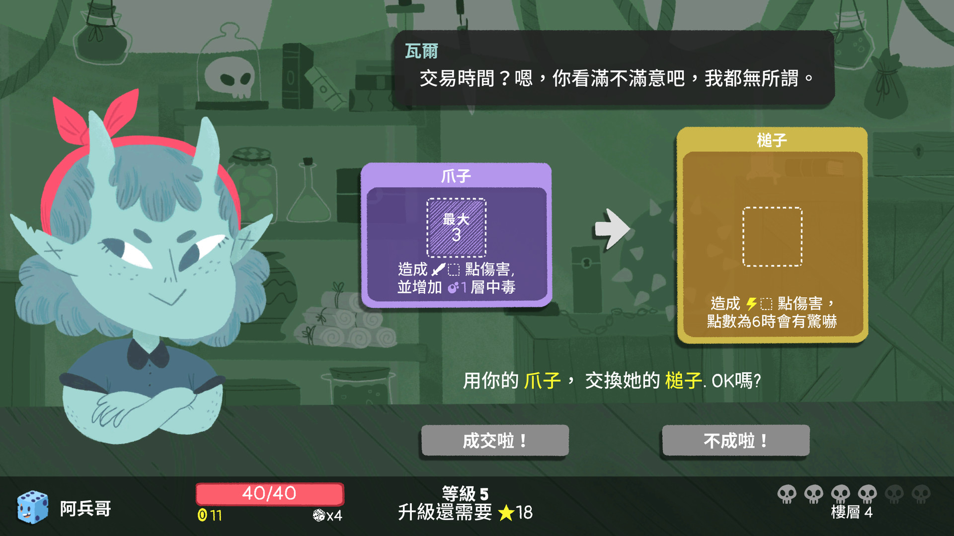 你將屠戮怪物,搜刮寶藏,在挑戰幸運女神的道路上變得越來越強大。但是,你能不能闖出一條生路呢?幸運可不會永遠站在你的那邊。面對翻滾無常的骰子,仔細權衡自己的策略吧!