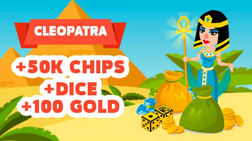 By purchasing this content, you get the Cleopatra character, Cleopatra dice, 100 gold and 50.000 chips.
