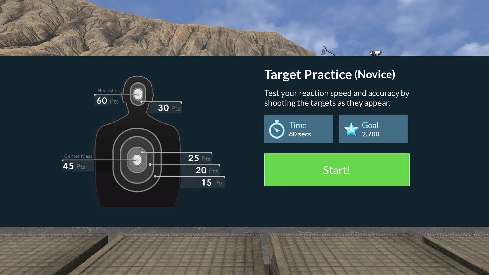Improve your accuracy, timing, and target-to-target transition in this classic shooting range mode. Center-mass bullseyes and headshots give more points. Rounds are timed and scored to provide feedback on your accuracy.