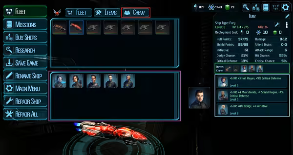 There have been several changes made to this screen. First, there is now a helpful "Crew" tab to let you manage your officers (highlighted in red). Beneath your ship display will be a roster of all your unassigned crew members (highlighted in purple).