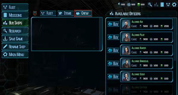 The store screen now has a new tab that you can click helpfully called "Crew" that will display your current crew members, as well as a list of all of the crew available. All of the types of crew can be hired right from the start of the game, if you can afford them. Crew members are much more expensive than items, but they don't increase your deployment cost and they offer a wider range of bonuses. Choose wisely.