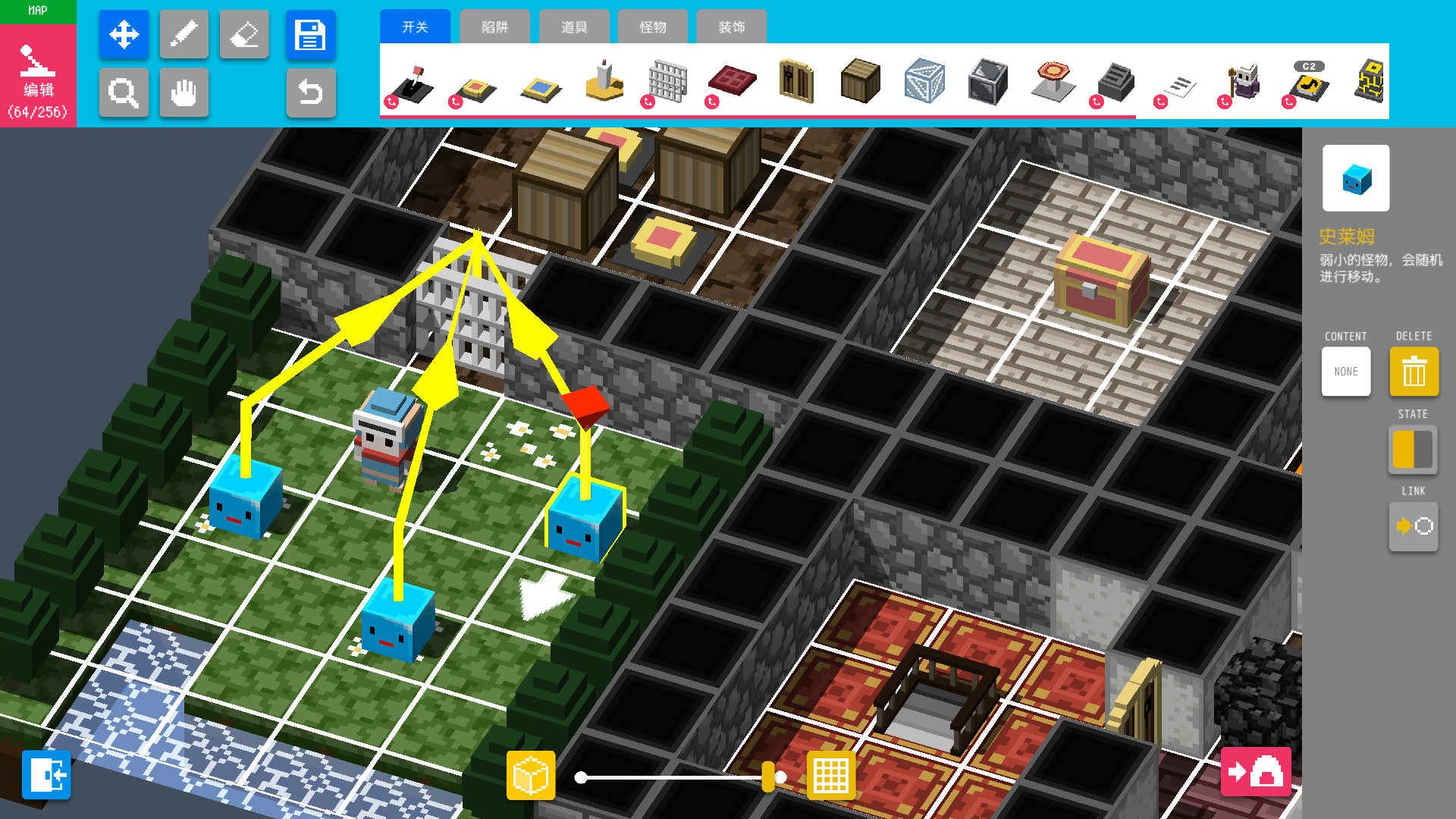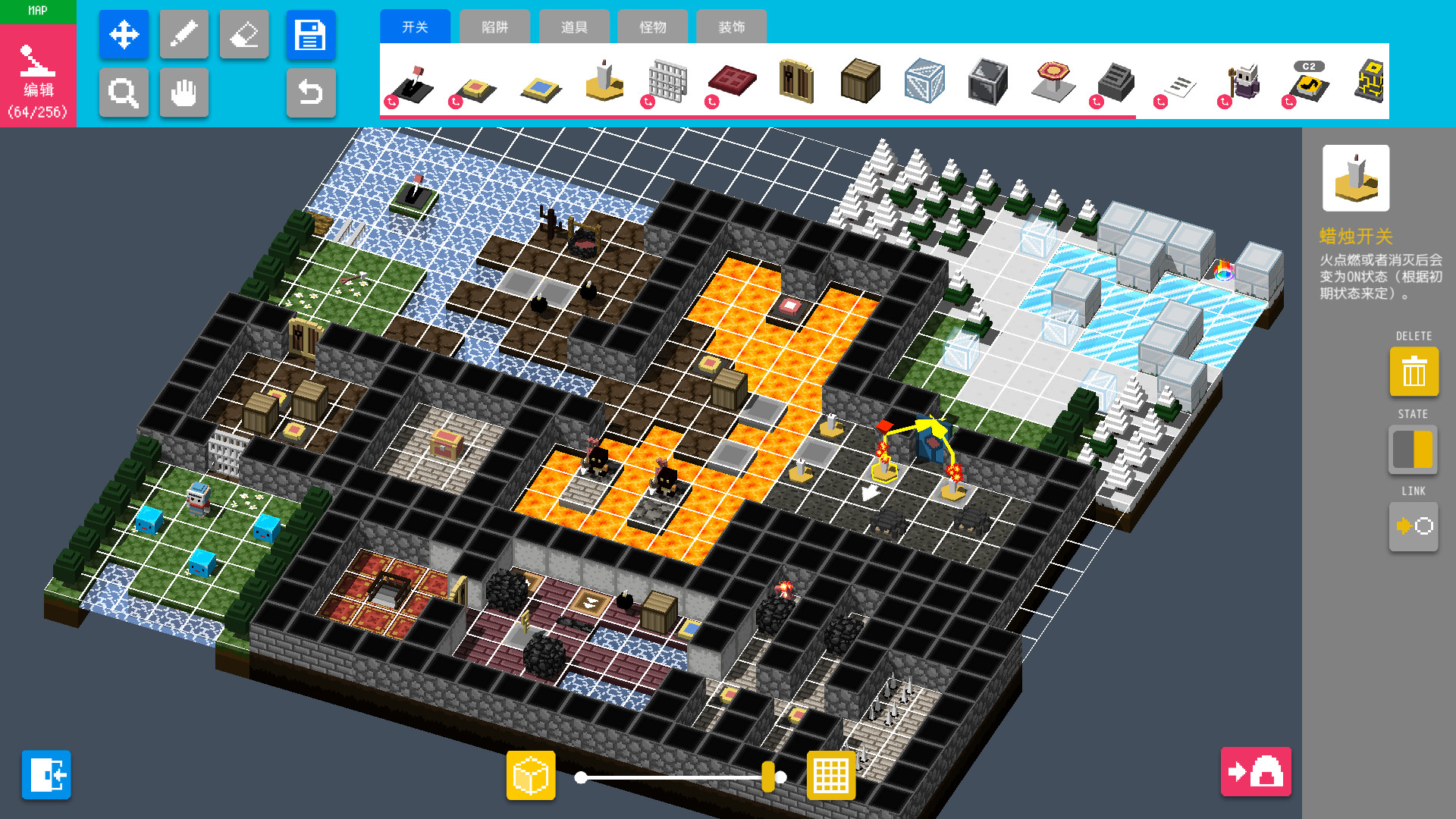 提到编辑器什么的,感觉有点难上手?其实完全不会。只要用鼠标简单点击,按照堆积木的感觉来做就可以了。掌握这种感觉之后,人人都可以开动脑筋,创造出有趣的谜题和机关。当然不仅仅是解谜类迷宫,偏向动作性的也没问题,甚至配置角色进去,还可以创造出世界观和剧情!