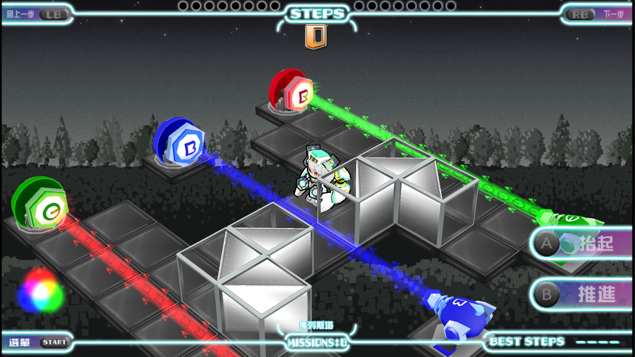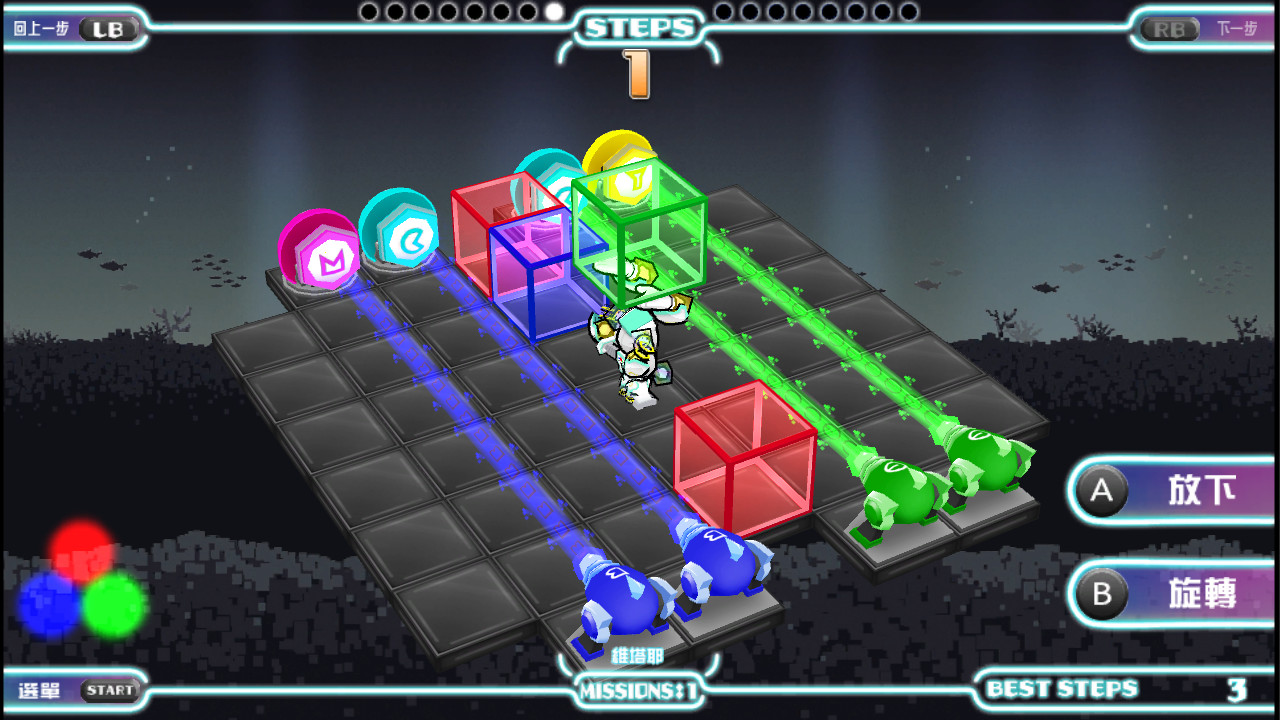 將從R、G、B、3色射出機中發射的光子,接上關卡內的正確顏色的集光機,即可通關!