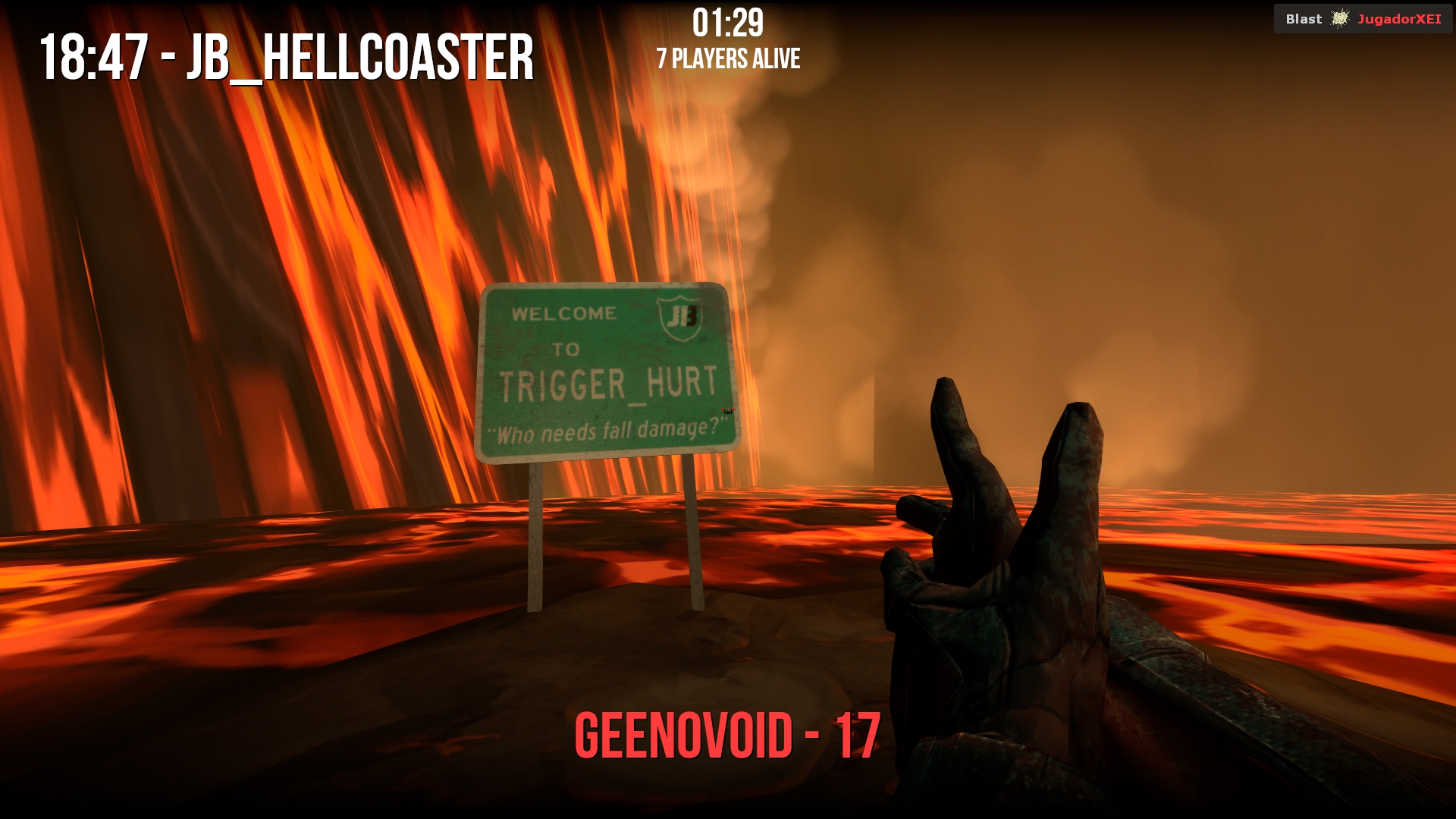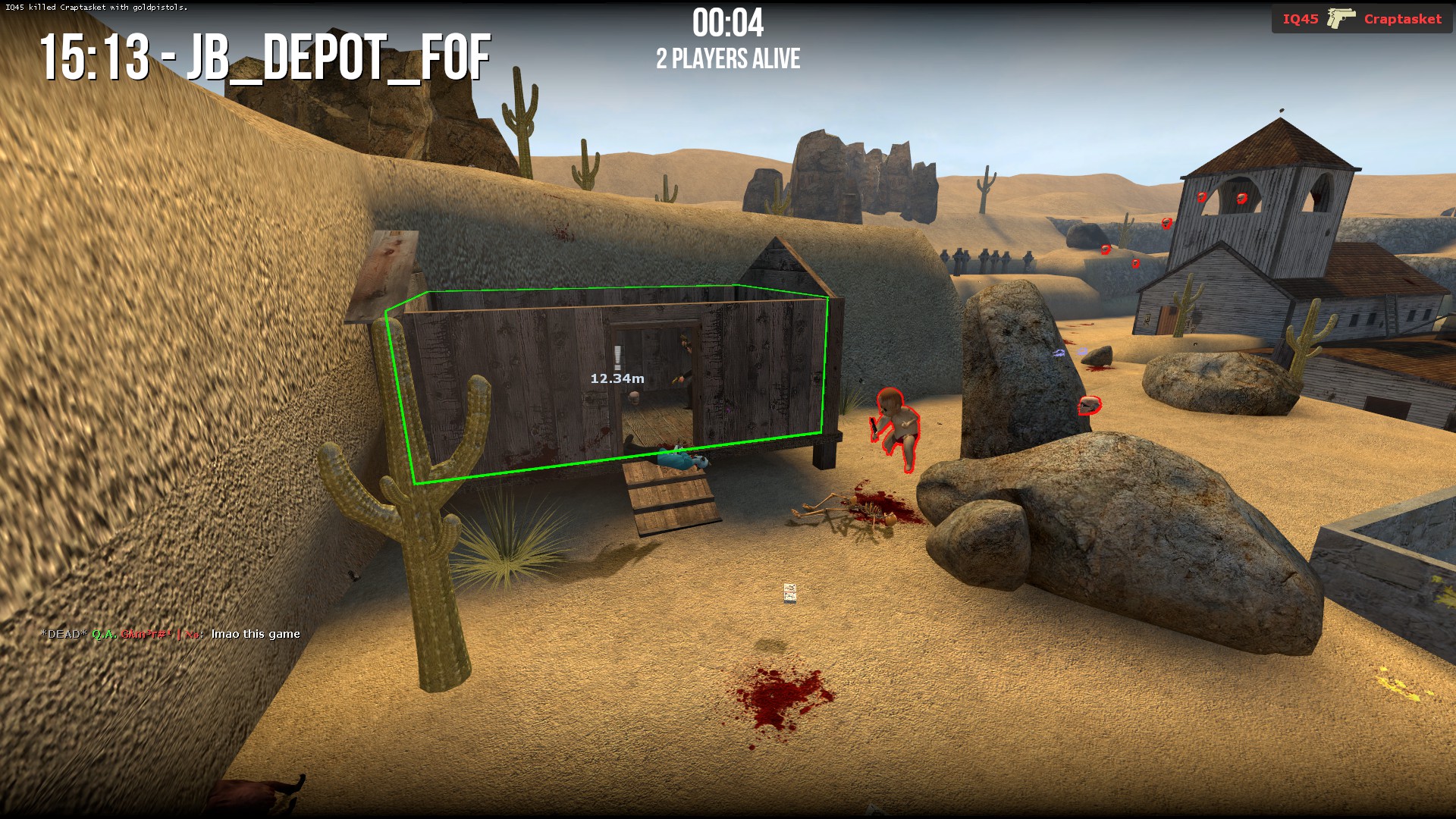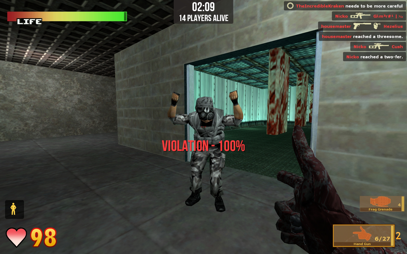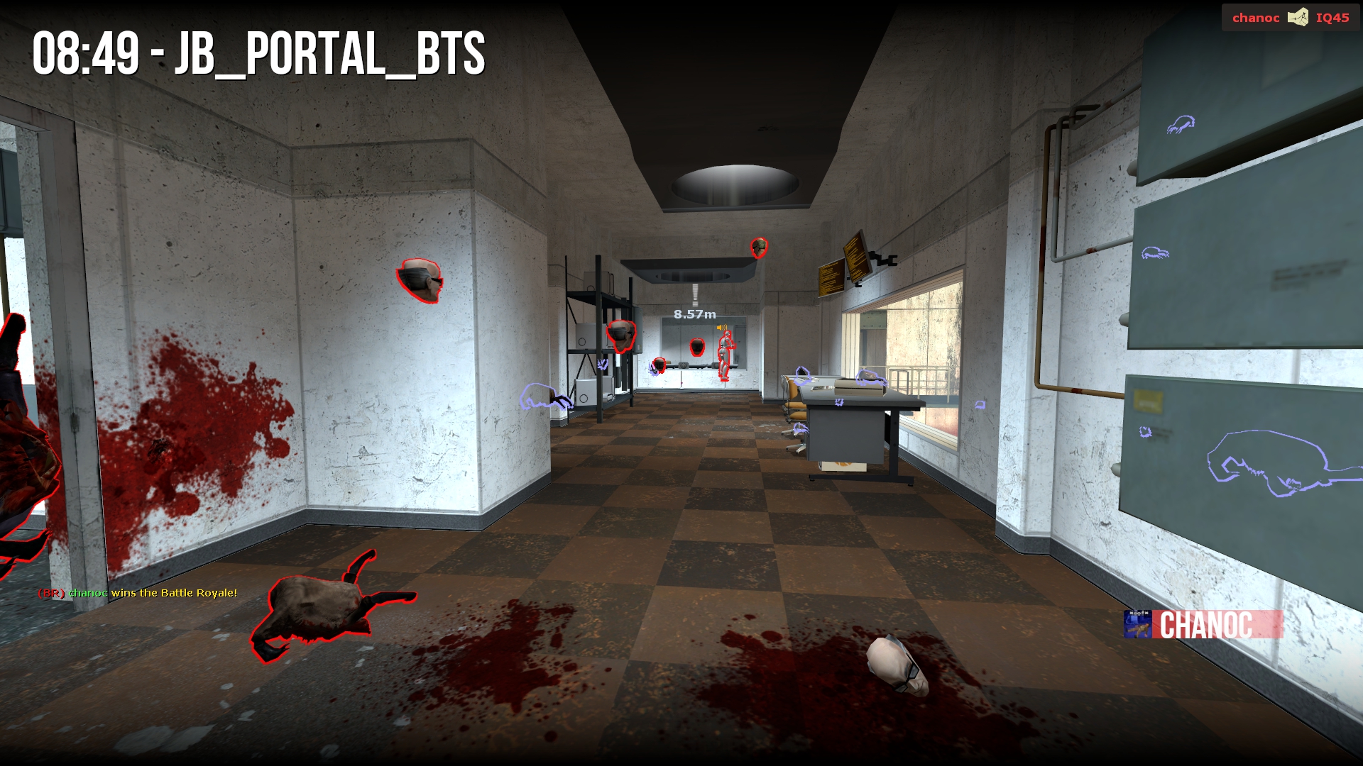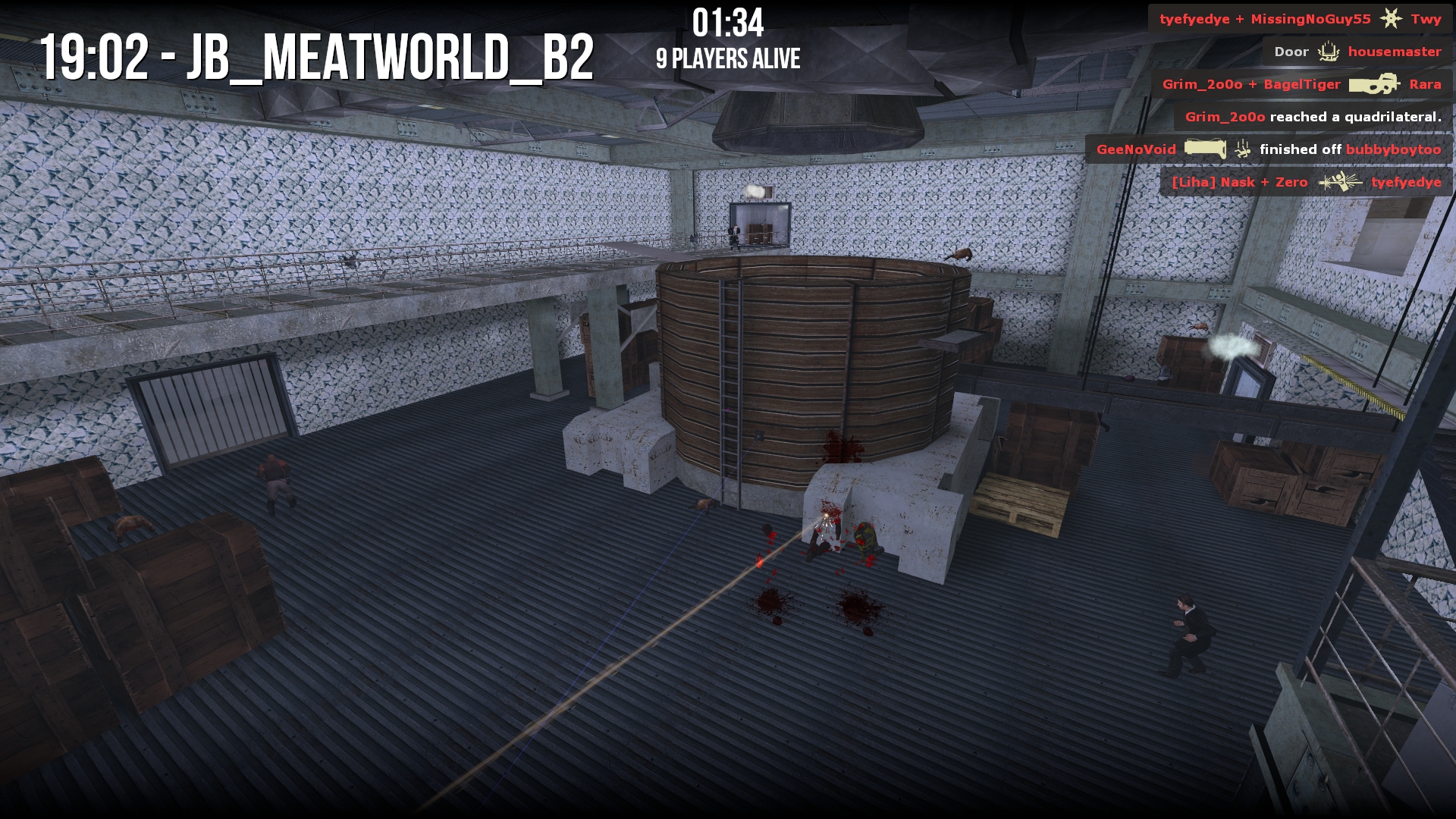 • Battle Royale - Based off and expanded from it’s appearance in the 2004 Half-Life 1 mod Jaykin’ Bacon, each round begins with every player being given a random weapon. The last player standing by the end of the round will be the victor. Additionally, random KOTH-style safe zones appear at round-end to funnel players together, thereby ensuring the round doesn’t just end in a draw. Mutators can also kick in for random rounds, and serve to wildly change the rules to help keep long games feeling fresh (EX: A mutator round where you can only use a certain gun, or another mutator where you can only move backwards).