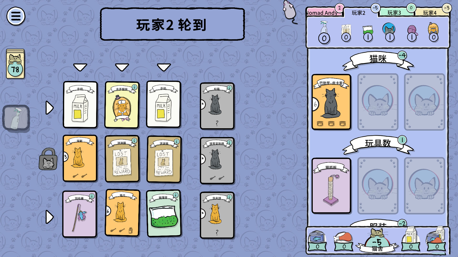 游戏中,你和你的猫女好友一回合可以抽3张牌,把玩具、食物、猫薄荷、服装,当然还有可爱的猫咪们通通收集起来。不过你要小心!一定要确保有足够的食物来喂猫,不然会被扣分。