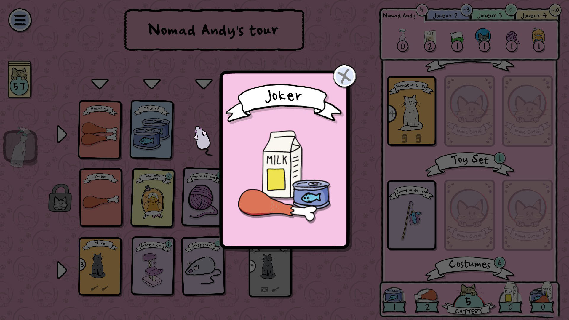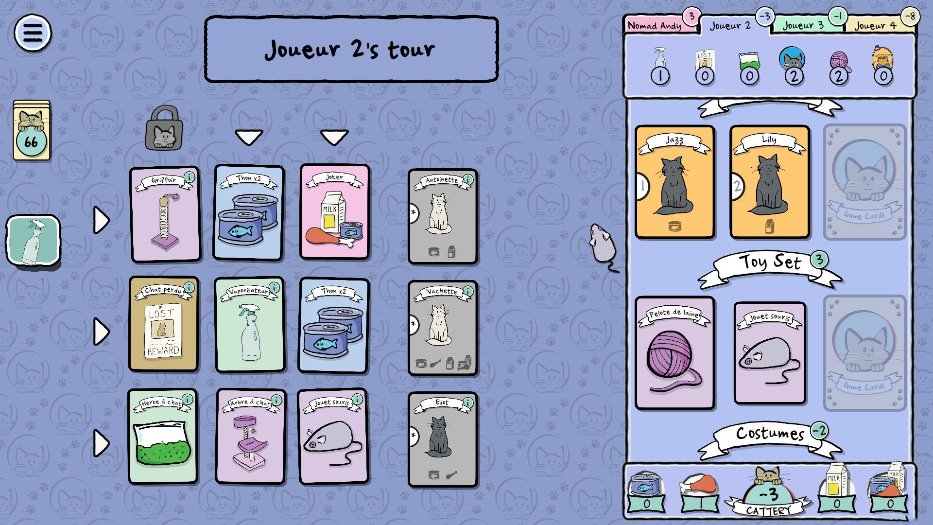 Pendant la partie, d'autres passionnés de chats et vous choisirez trois cartes à la fois, pour récupérer des jouets, de la nourriture, de l'herbe à chat et bien sûr, des chats adorables. Mais attention ! Assurez-vous d'avoir assez de nourriture pour tous vos amis félins ou vos chats affamés vous feront perdre des points.