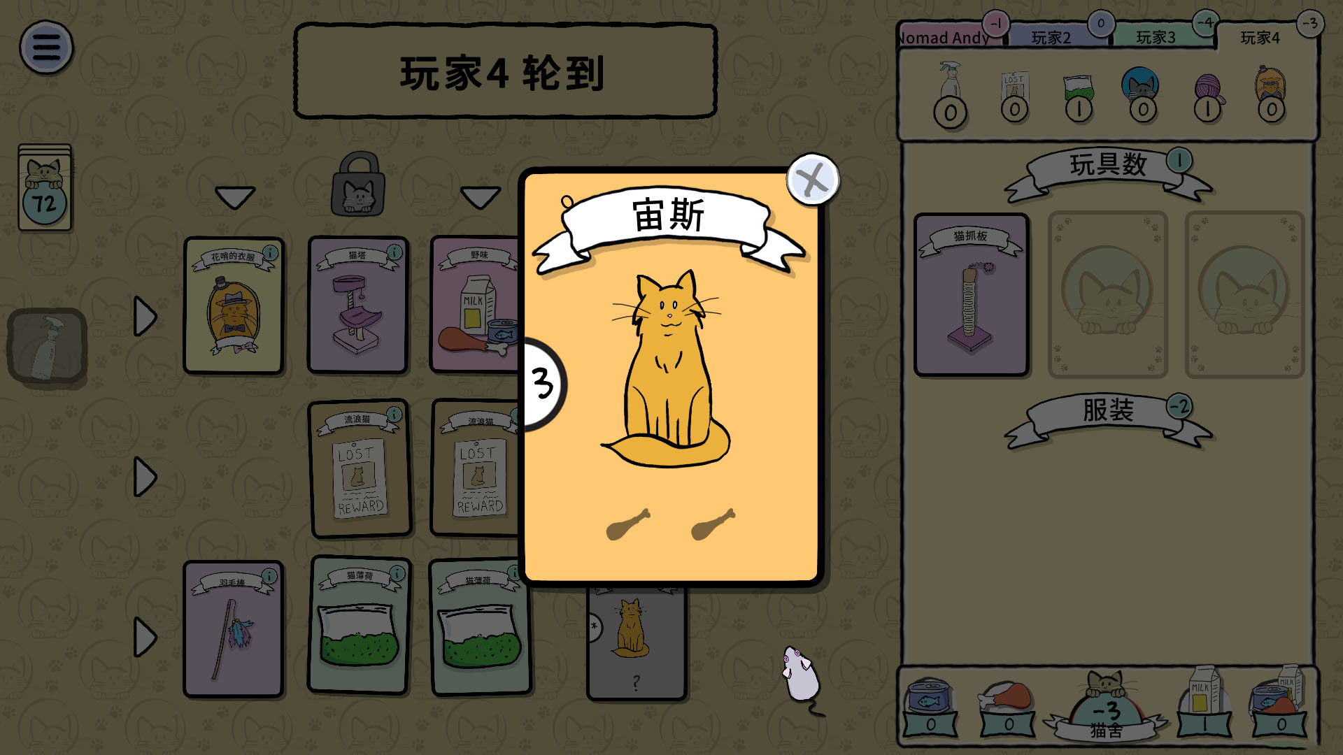 游戏中,你和你的猫女好友一回合可以抽3张牌,把玩具、食物、猫薄荷、服装,当然还有可爱的猫咪们通通收集起来。不过你要小心!一定要确保有足够的食物来喂猫,不然会被扣分。