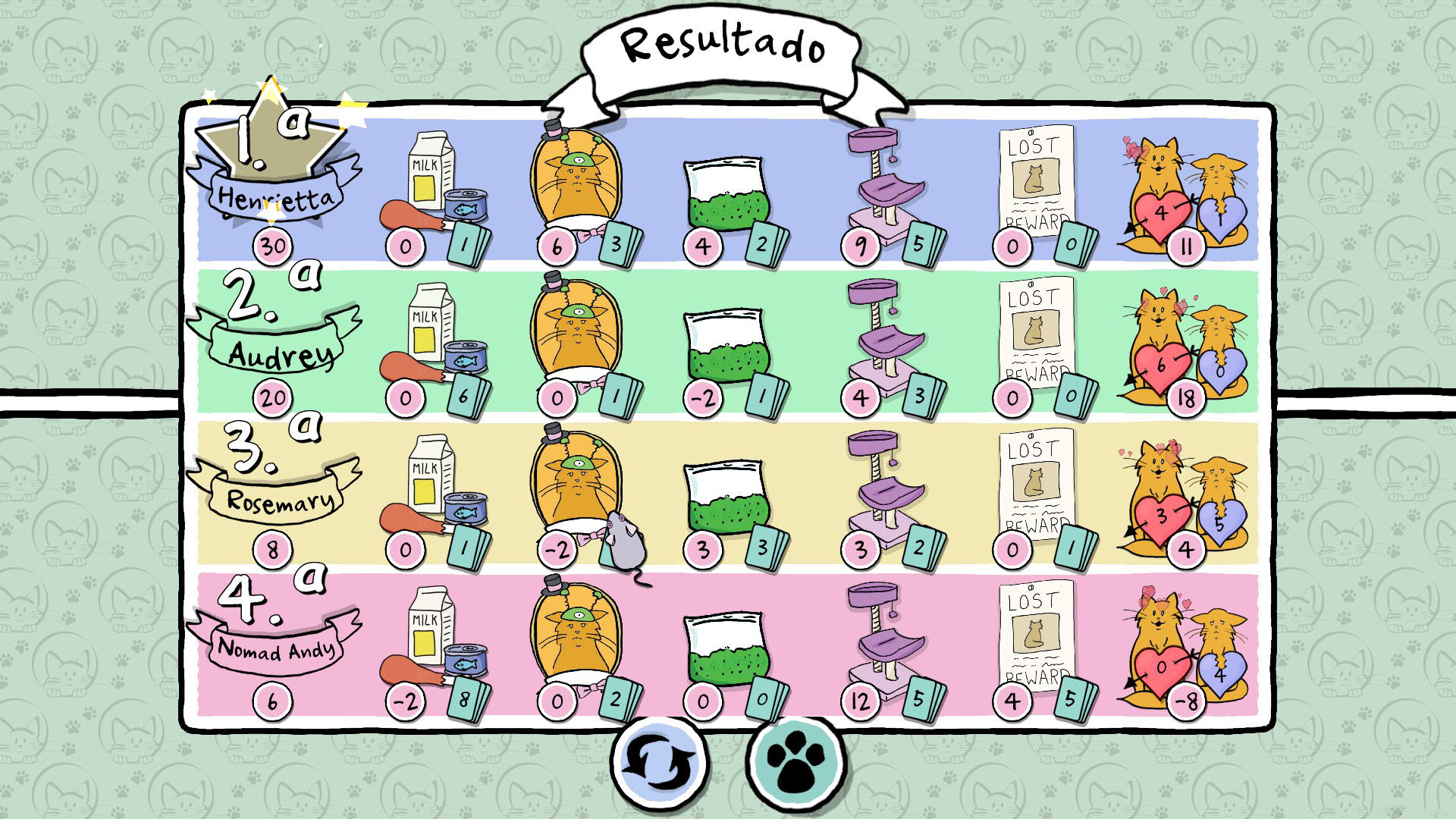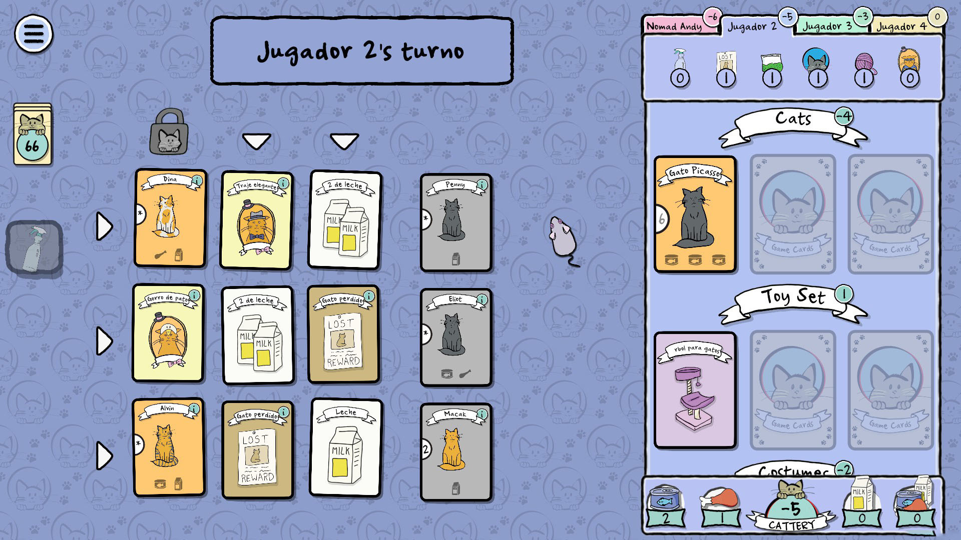Durante la partida, las otras amas y tú sacaréis cartas de tres en tres y recogeréis juguetes, comida, hierba gatera, disfraces y, por supuesto, gatos. ¡Pero cuidado! Aseguraos de que tenéis suficiente comida para todos vuestros amigos gatunos, o los gatos hambrientos os quitarán puntos.