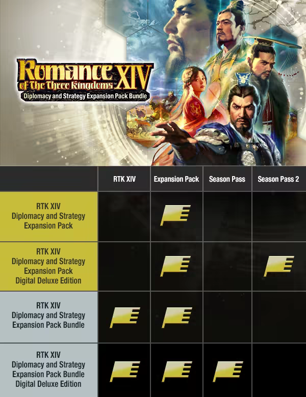 Note: Both "ROMANCE OF THE THREE KINGDOMS XIV", as well as the "ROMANCE OF THE THREE KINGDOMS XIV Digital Deluxe Edition", which includes the Season Pass are on sale. Please note this when making your purchase.