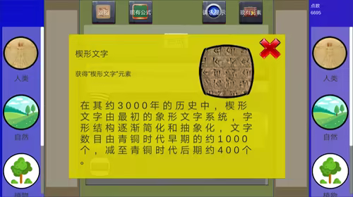 A:虽然前期关卡大多合成公式都是这种简单并且通过常识就可以接触的。但是随着关卡的推进,你甚至需要去得到古埃及战士“美尼斯”或是古巴比伦的“汉谟拉比法典”,甚至是中国上古君王颛顼的功绩。所以玩家通过元素合成在关卡中探索可以学到知识,另一方面,过关期间每个公式、成就都会存在不少相关知识介绍,有兴趣的玩家也可以进一步了解相关历史知识。