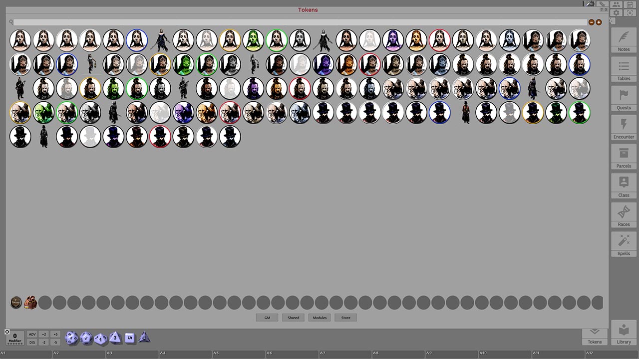 This token pack includes (ringed in black, blue, gold, green, greyscale, and silver, as well as ethereal, invisible, stone-skinned, sand-skinned, and altered state versions):