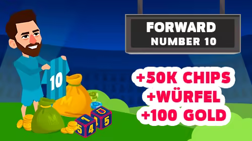 Nachdem dem Erwerb dieses Inhalt fügst du deiner Sammlung den Charakter "Stürmer Nummer 10", "Würfel Nummer 10", sowie 100 Gold und 50.000 Chips hinzu.