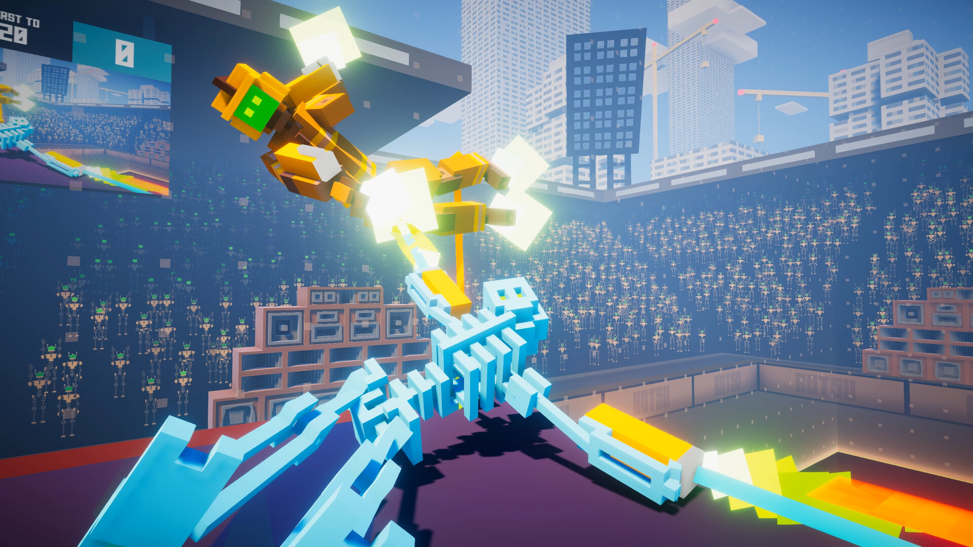 These aren't your average sluggish ragdolls. You're a Bot athlete at the height of your career. You can sprint, jump, flip, climb, breakdance, fly and break through the sound barrier with your overpowered rocket boosters as you combine acrobatics with combat in the world's most ridiculous display of physics-based fighting.